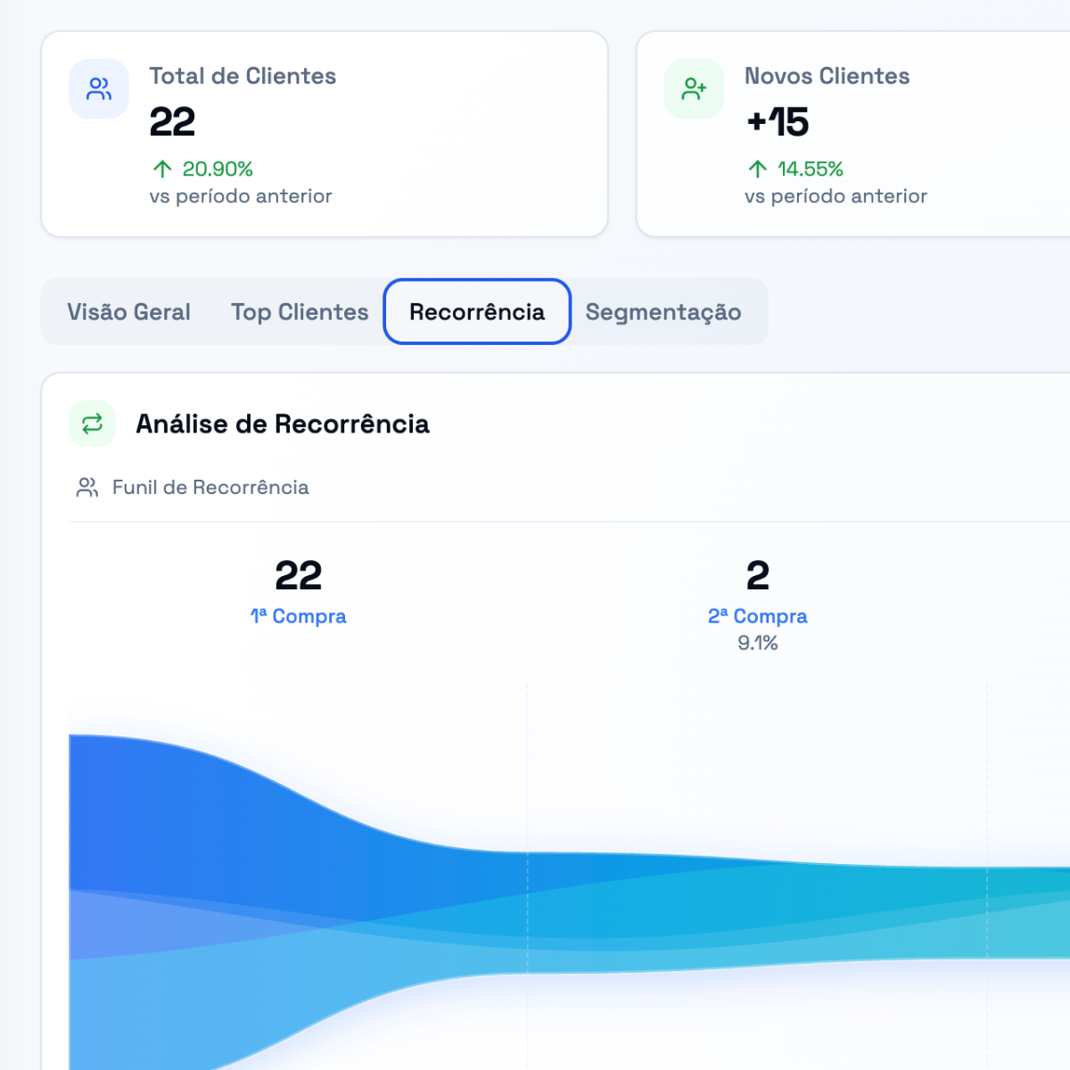 Veja quem comprou e não voltou. Entenda o comportamento de recompra mês a mês e melhore a retenção de clientes.